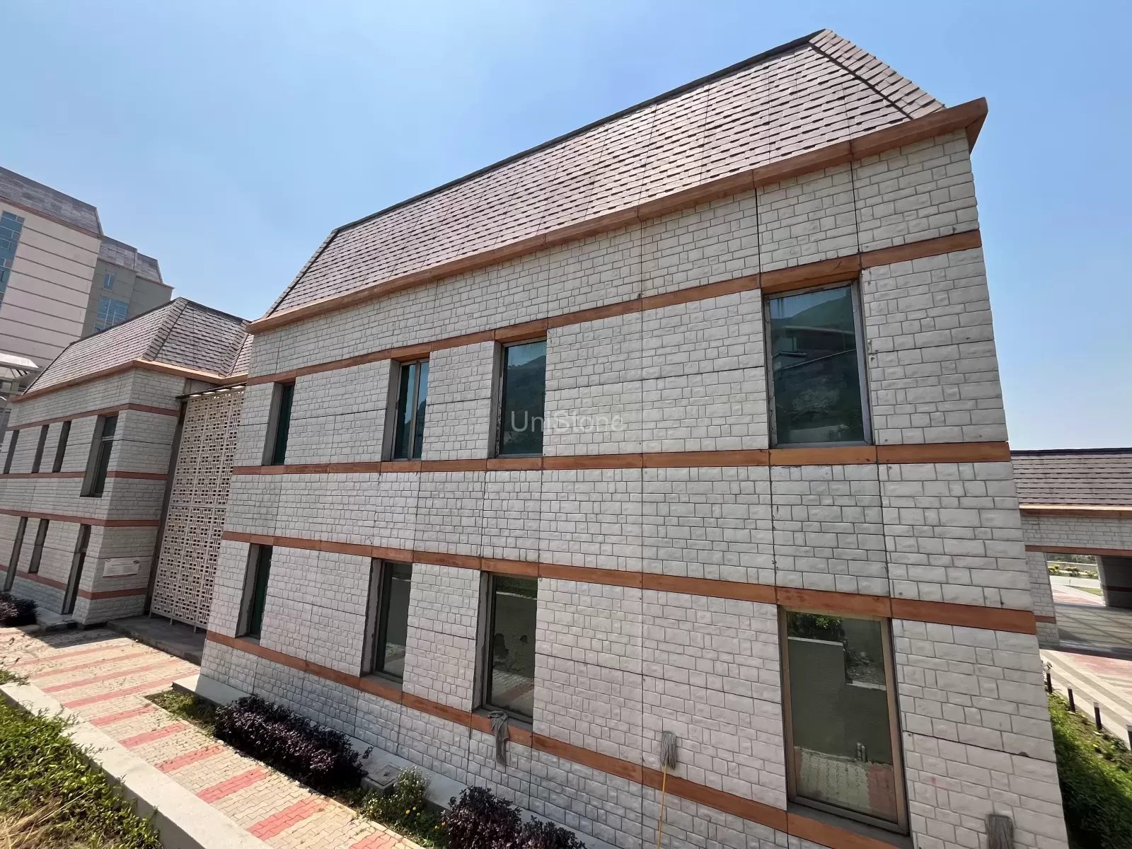 - To add a unique touch, bands with the appearance of timber were interspersed between the stone-look panels.
