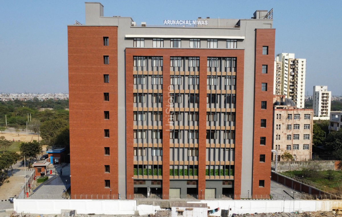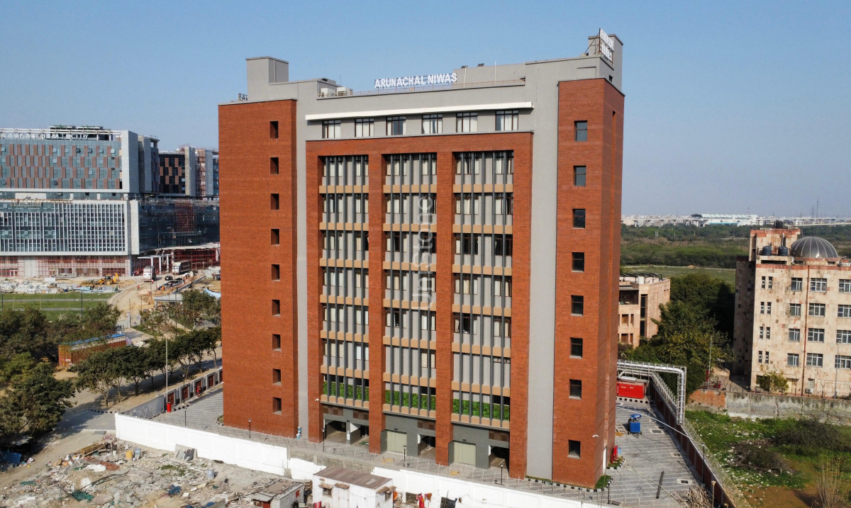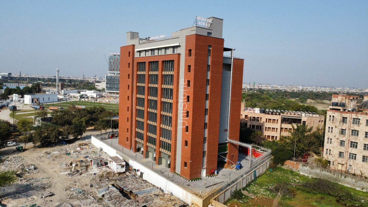 The Arunachal Niwas project in Dhirpur, New Delhi, is a significant government development undertaken by the Public Works Department (PWD). Designed by SSSA Architects, the project focuses on sustainable, low-maintenance, and climate-responsive architecture using natural clay materials for the façade.