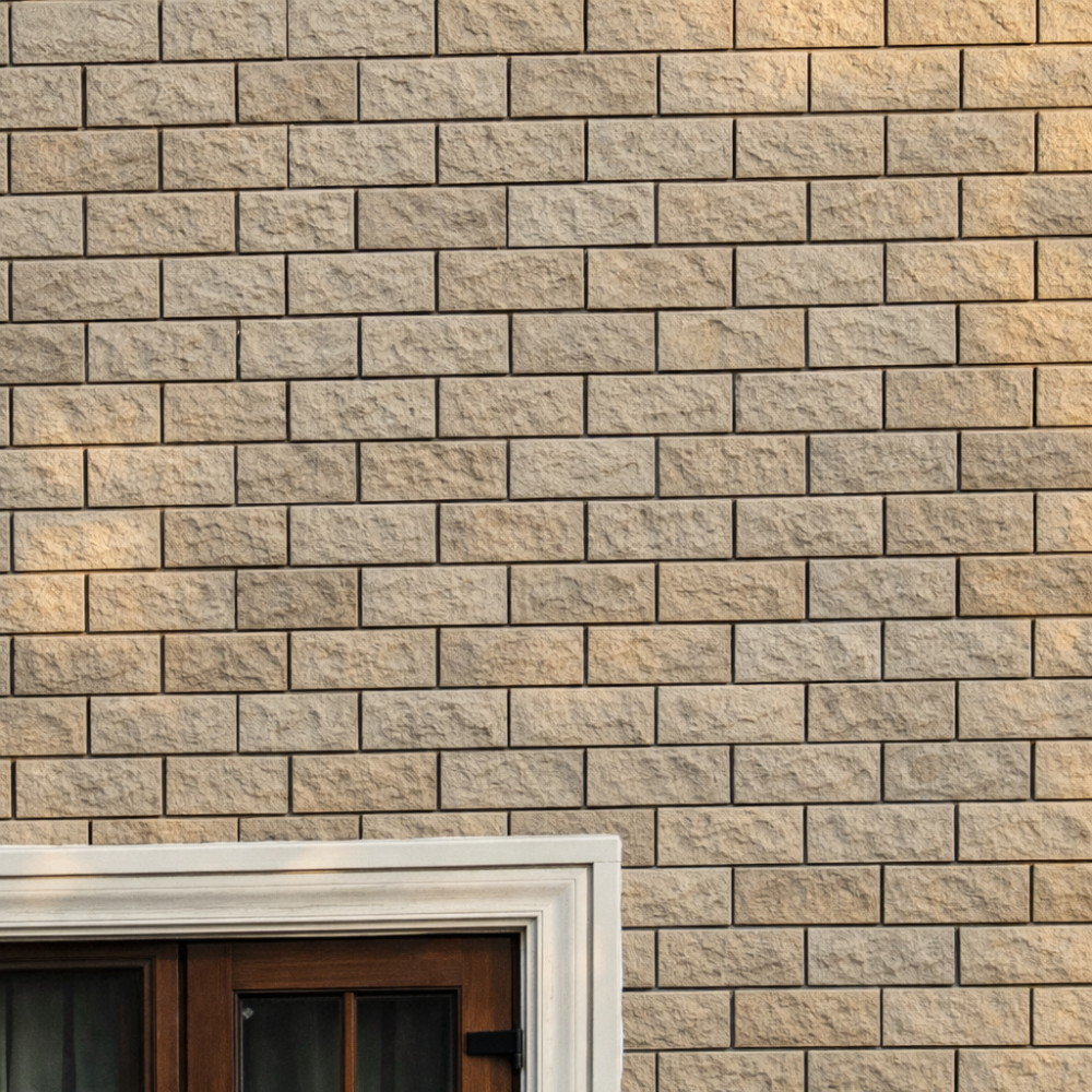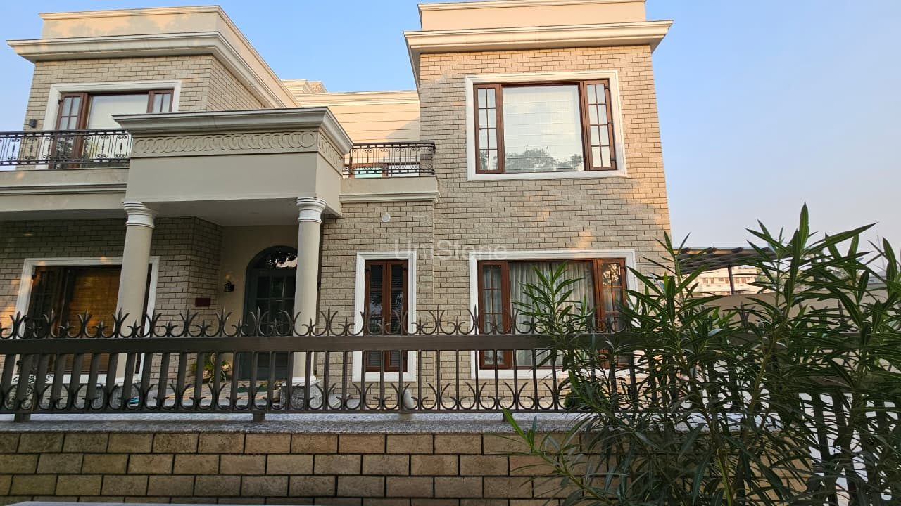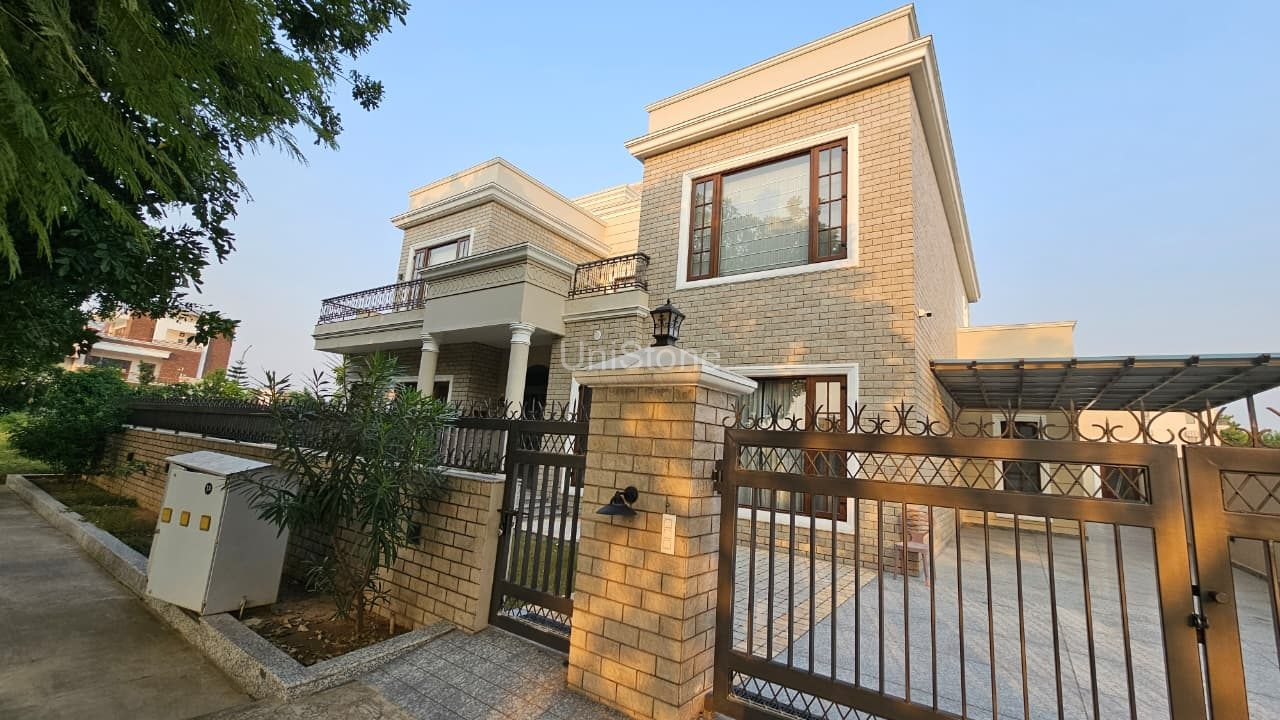 Unistone supplied and executed Weathered Stone – 4″ × 10″, enhancing the farmhouse elevation with a rugged yet refined stone appearance.