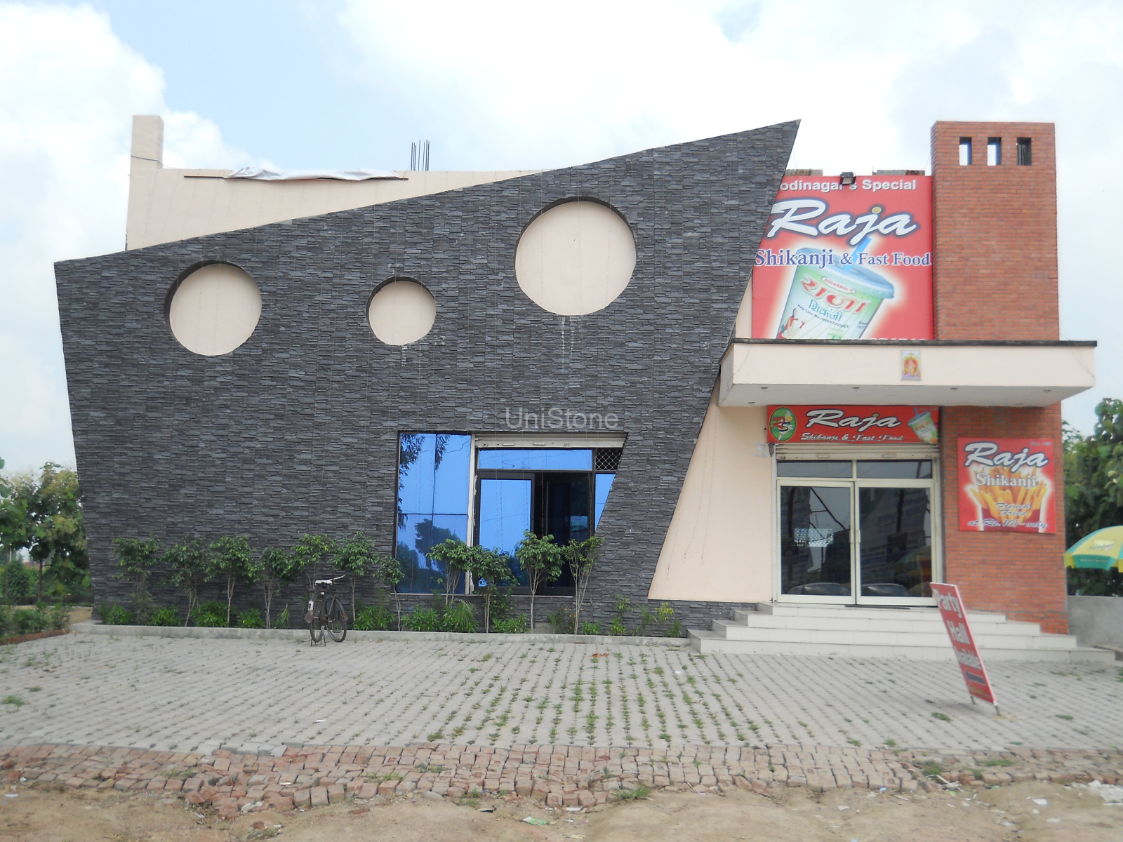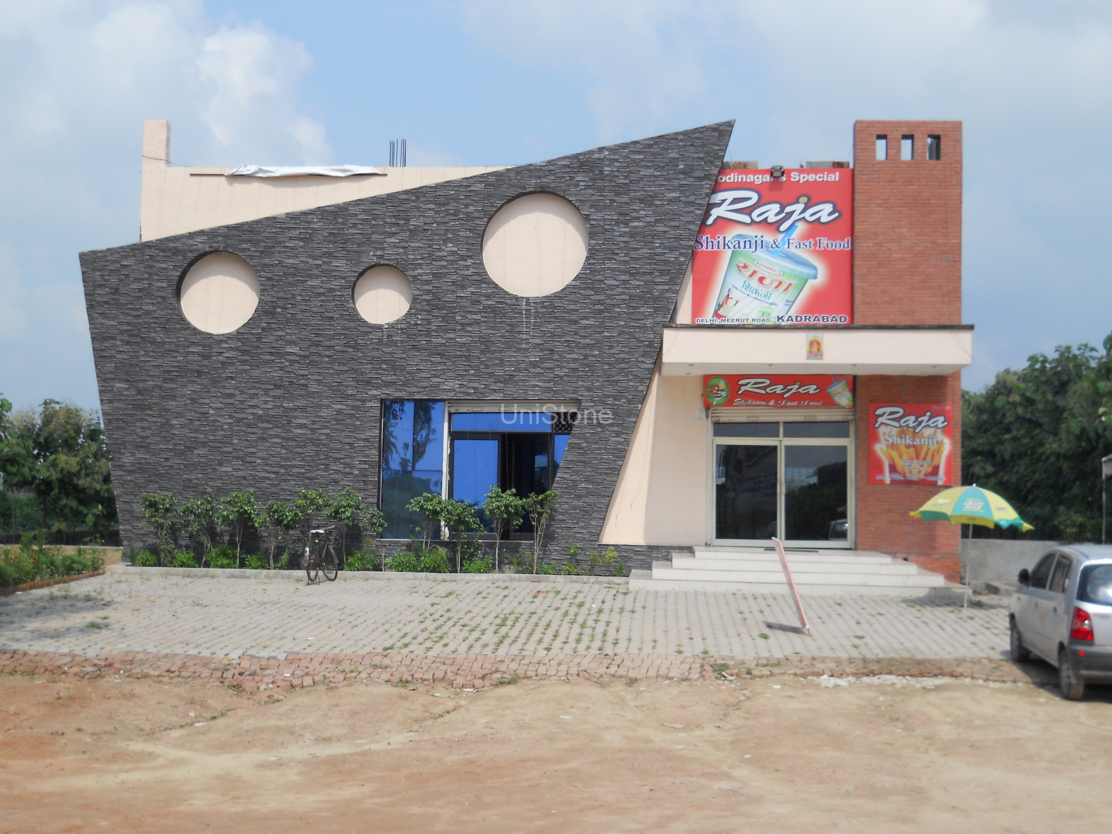 The Raja Shikanji & Fast Food façade now highlights Unistone’s expertise in combining brick and stone finishes, achieving a distinctive, durable, and visually balanced commercial exterior that aligns with the brand’s dynamic presence.
