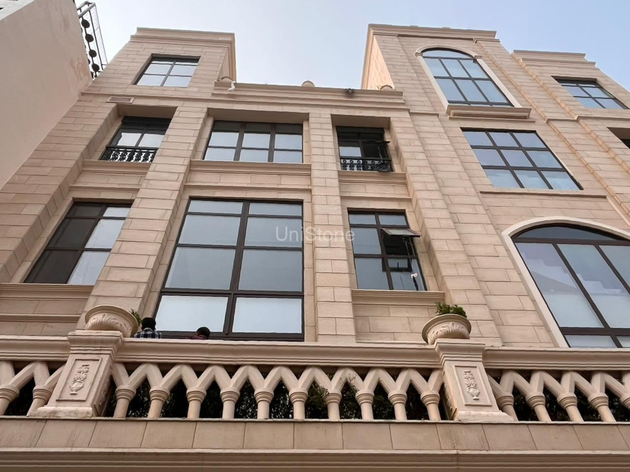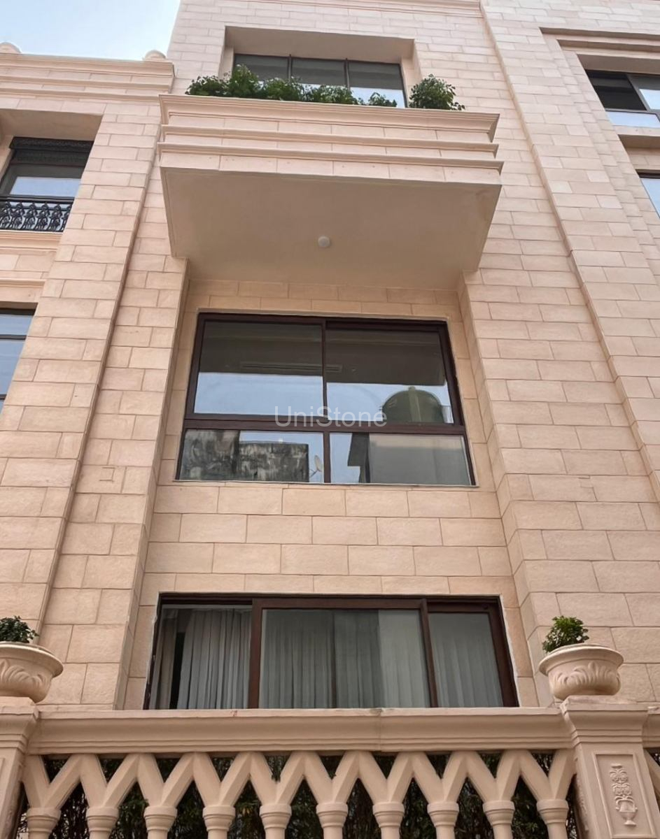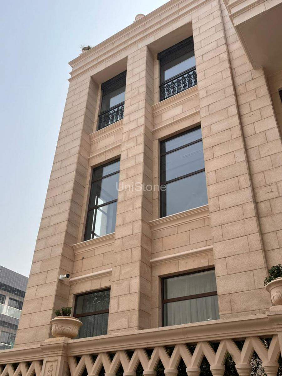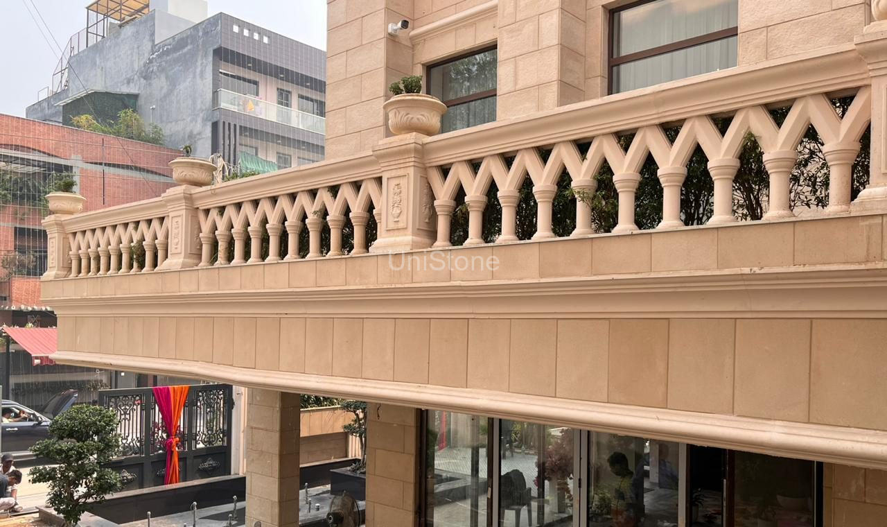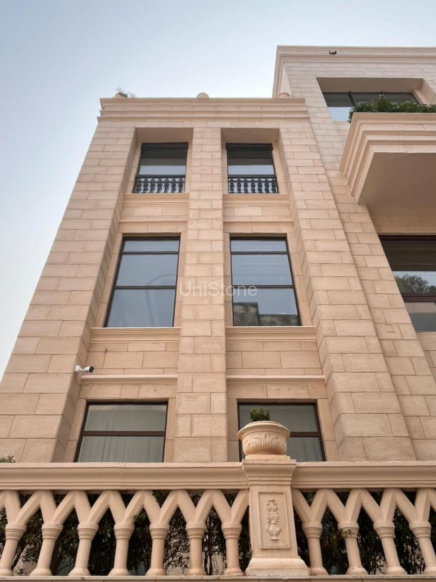 Unistone supplied and executed SFP (Stonecrete Façade Panels) with hybrid fixing along with custom GRC balusters for the elevation.
