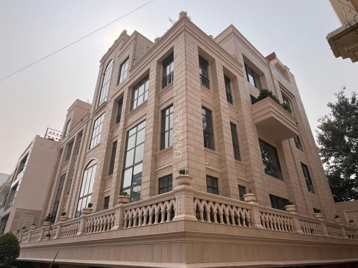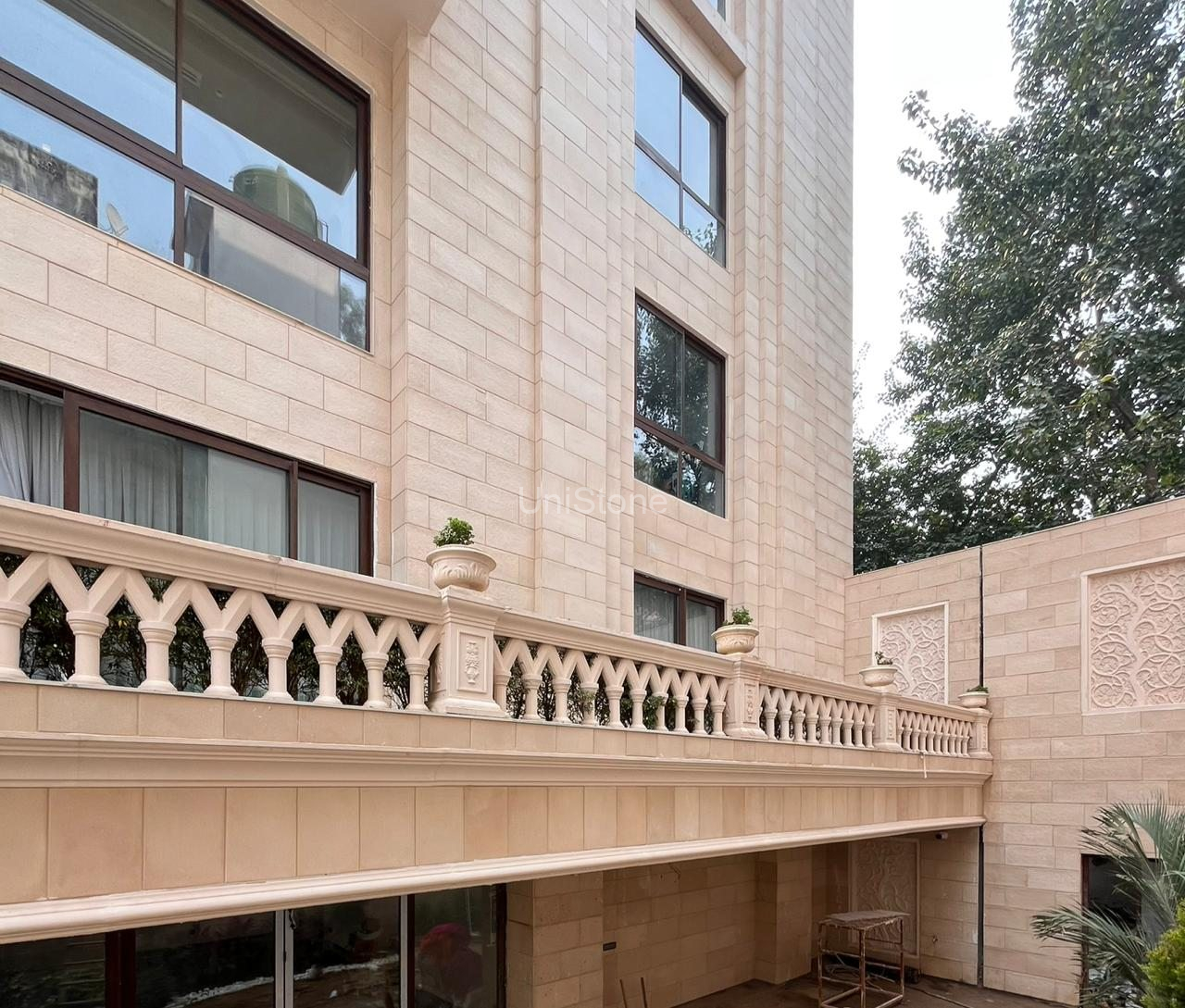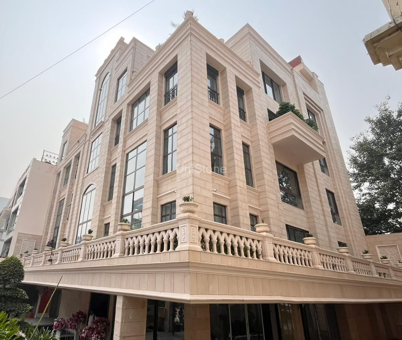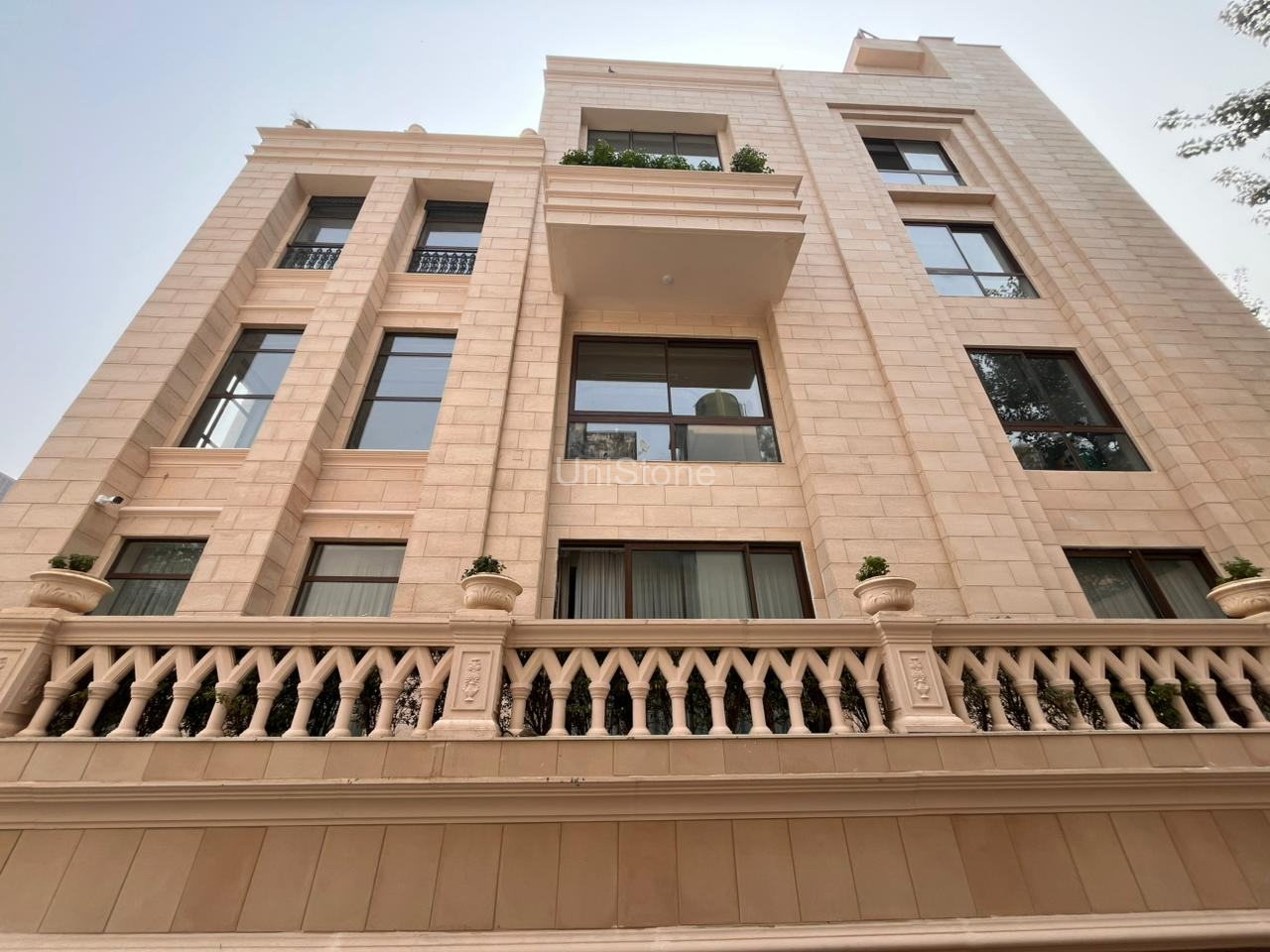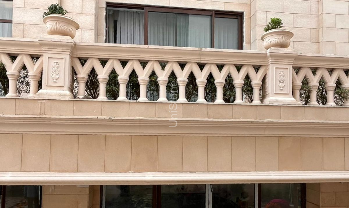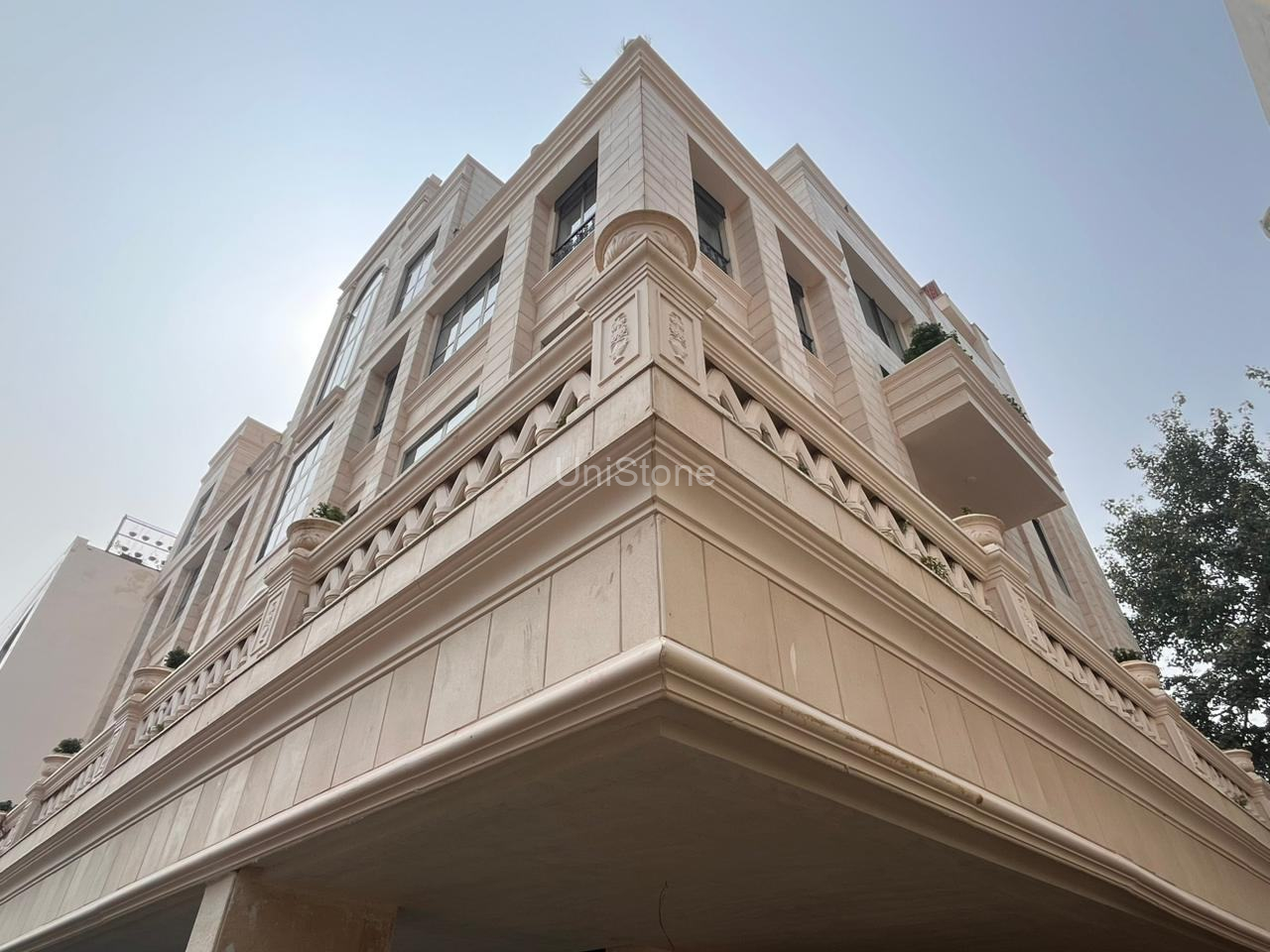 Unistone supplied and executed SFP (Stonecrete Façade Panels) with hybrid fixing along with custom GRC balusters for the elevation.