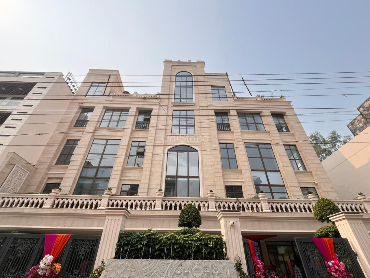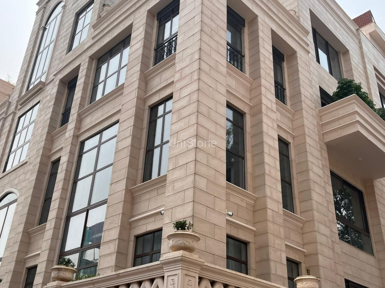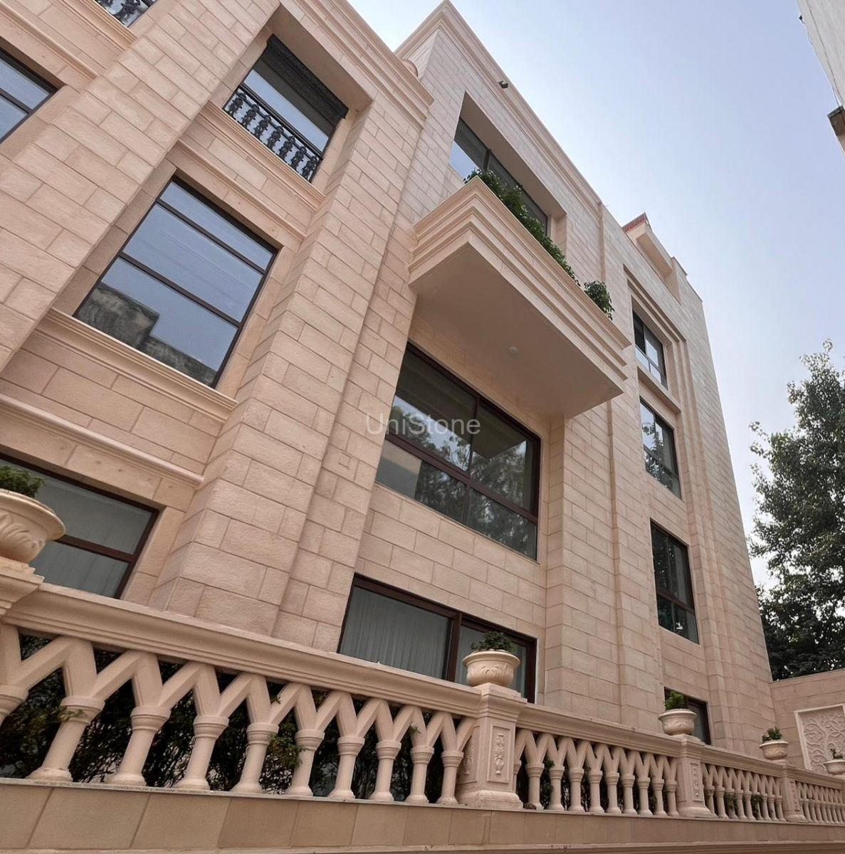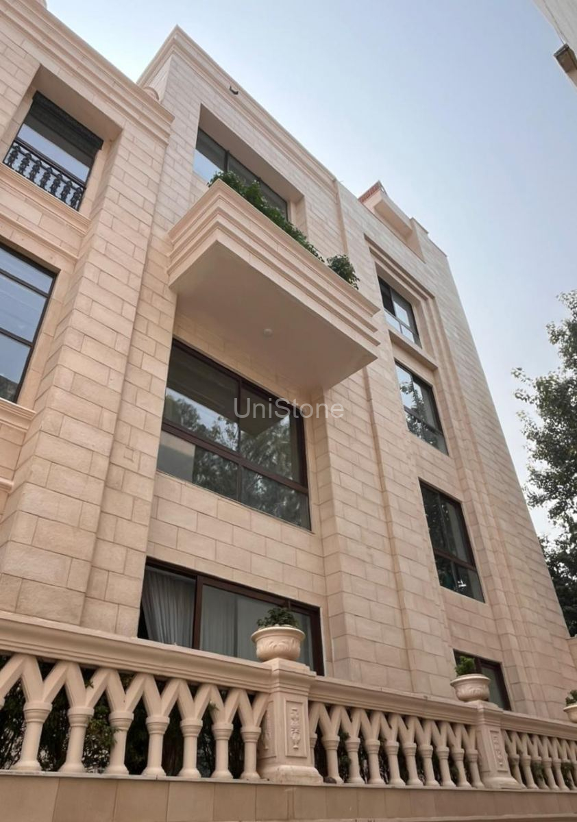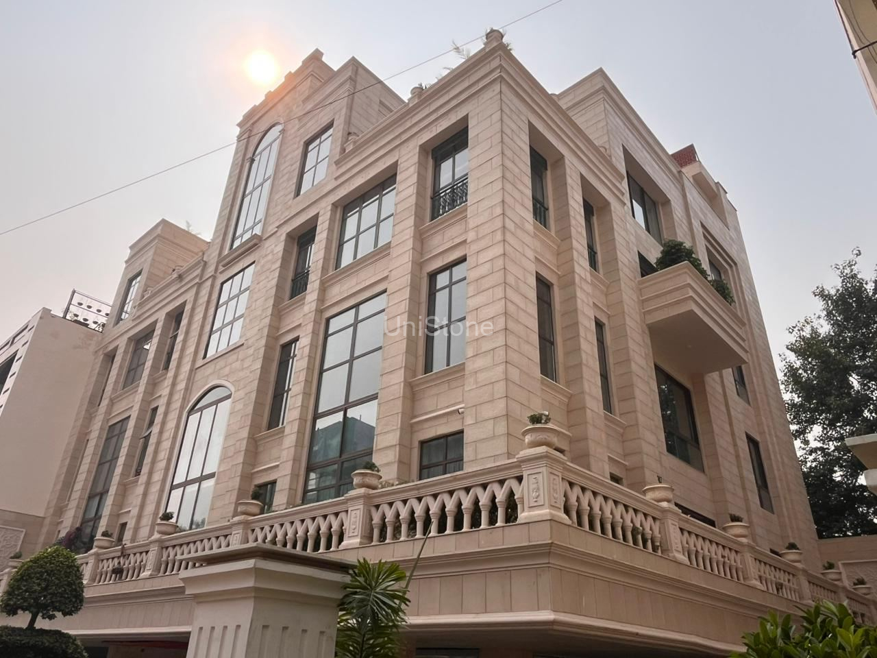 Unistone supplied and executed SFP (Stonecrete Façade Panels) with hybrid fixing along with custom GRC balusters for the elevation.