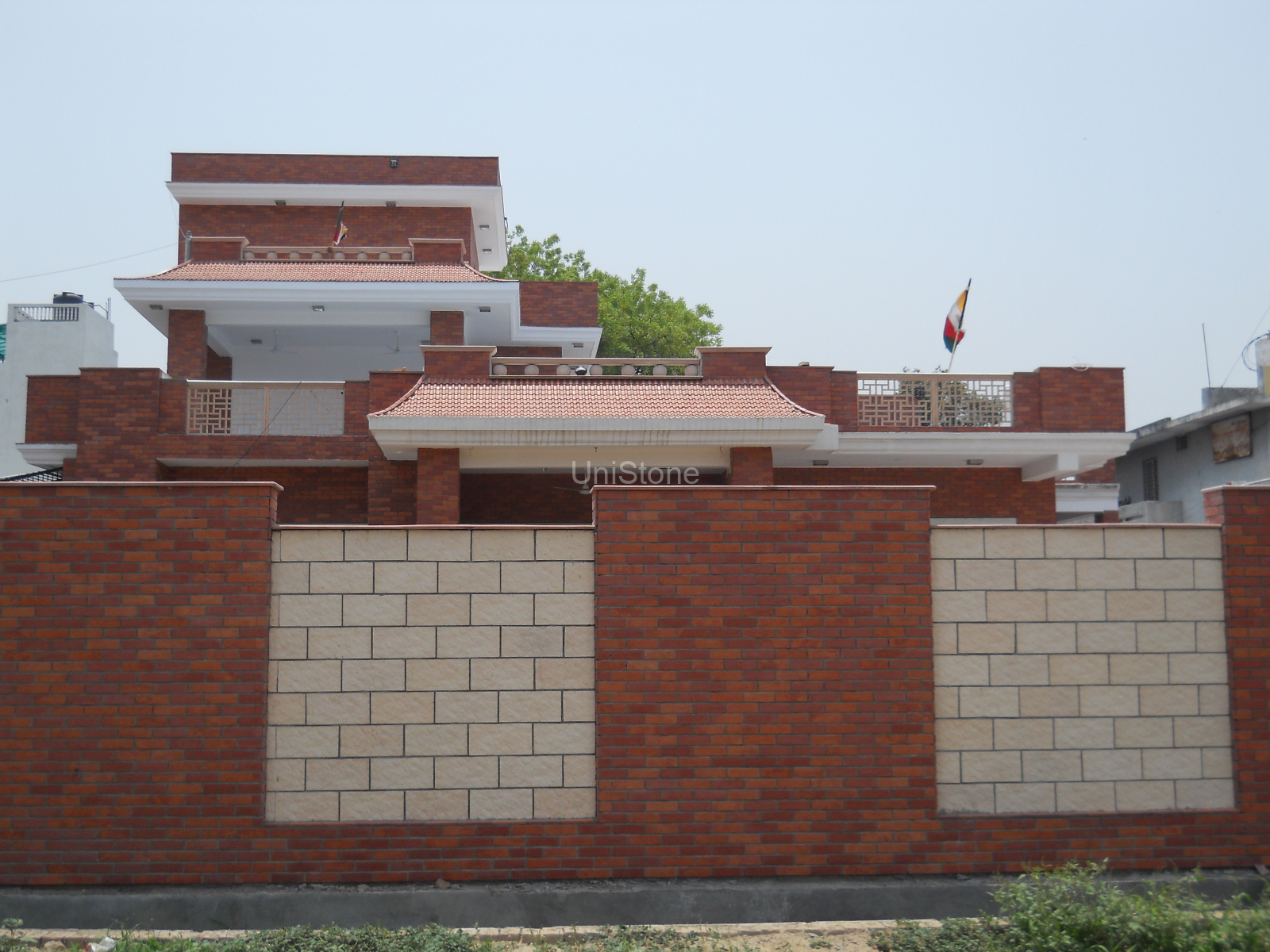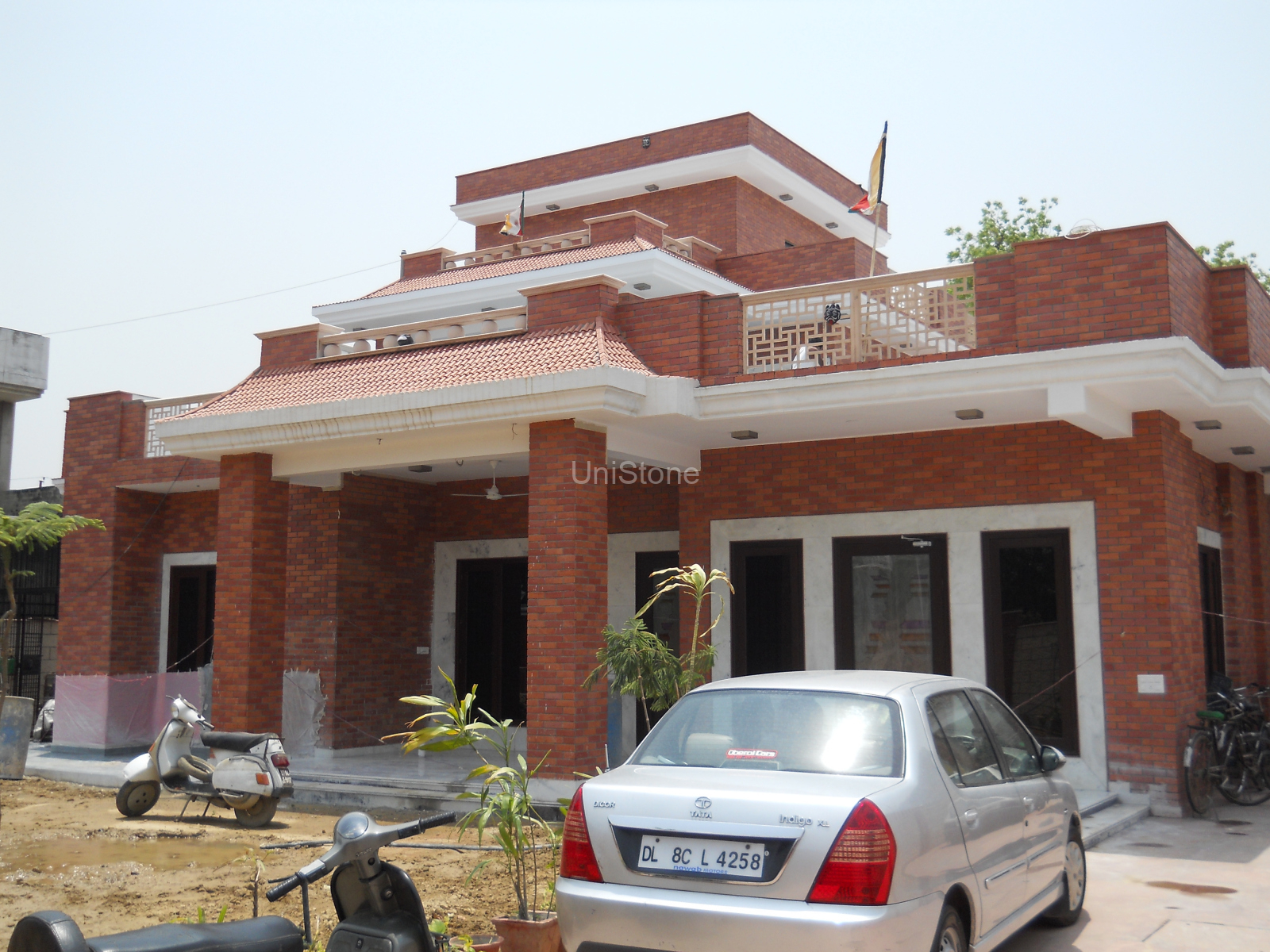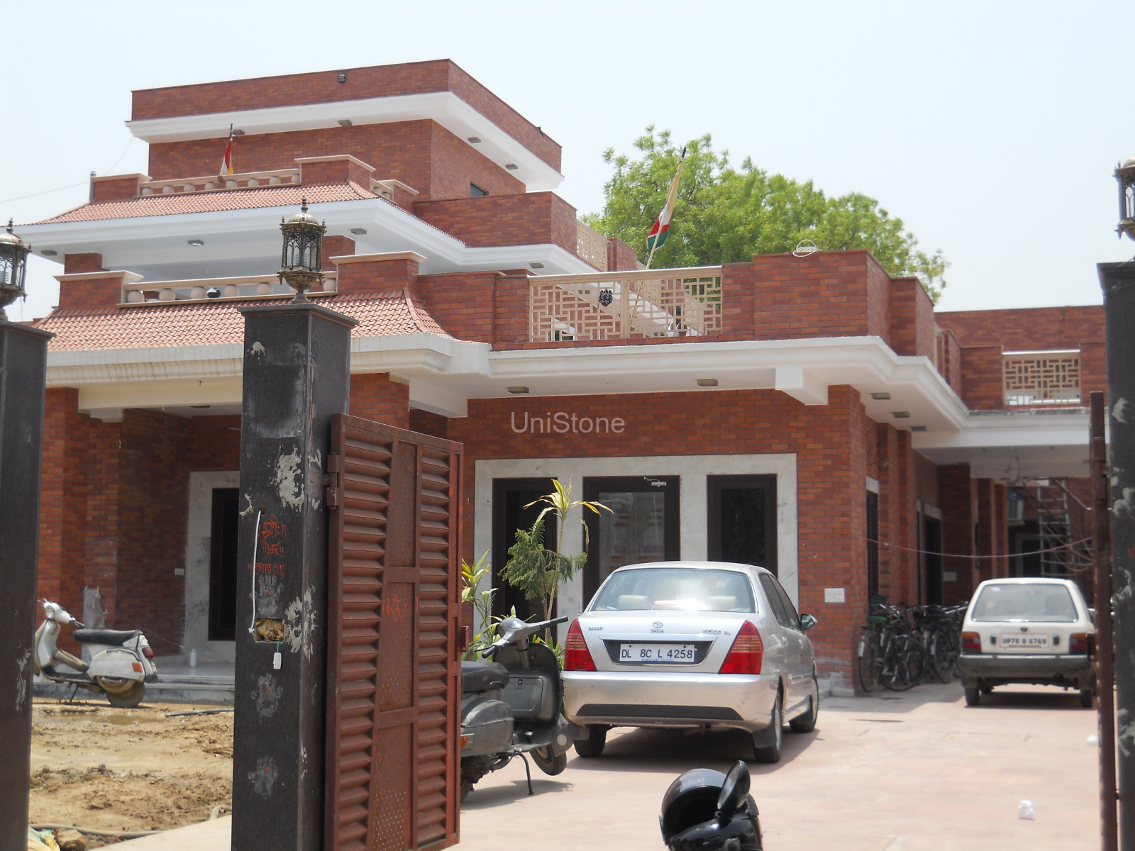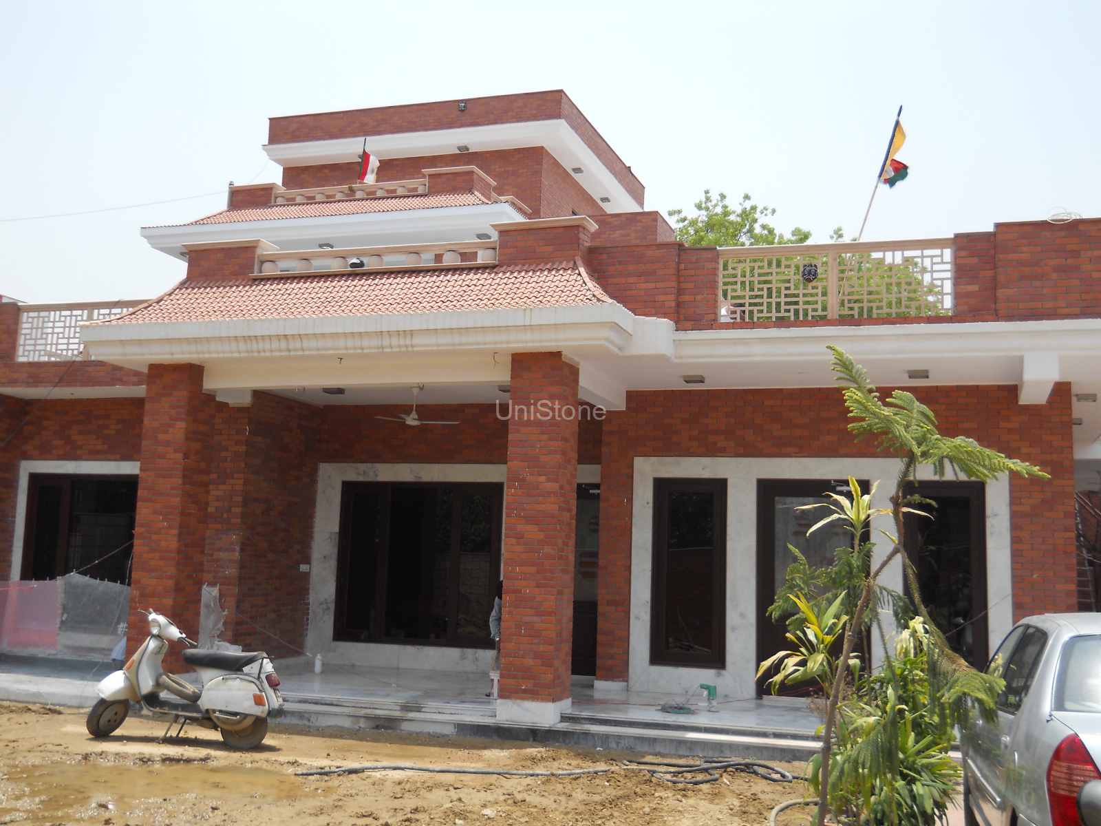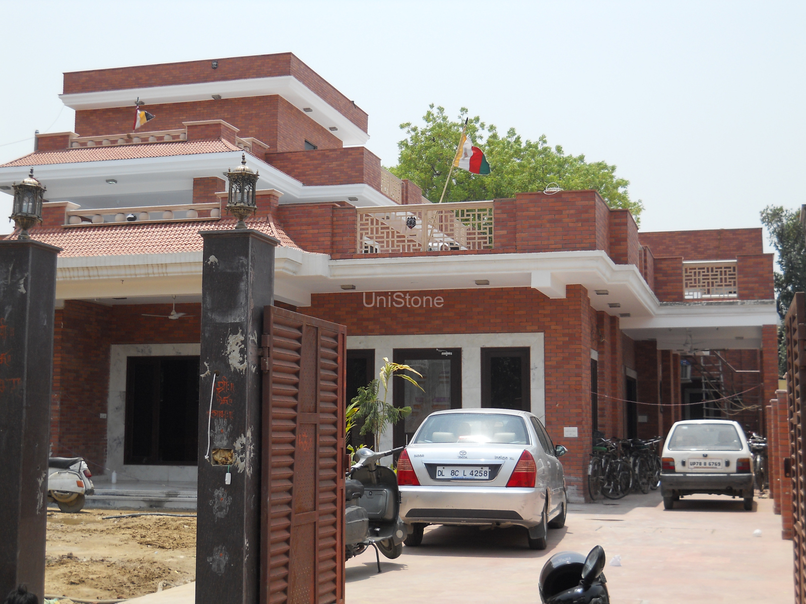 The façade of the Raj Nagar Residence now showcases Unistone’s expertise in multi-material residential façades, seamlessly combining brick textures, stone panels, and decorative GRC jalis to create a visually rich, durable, and architecturally refined home exterior.