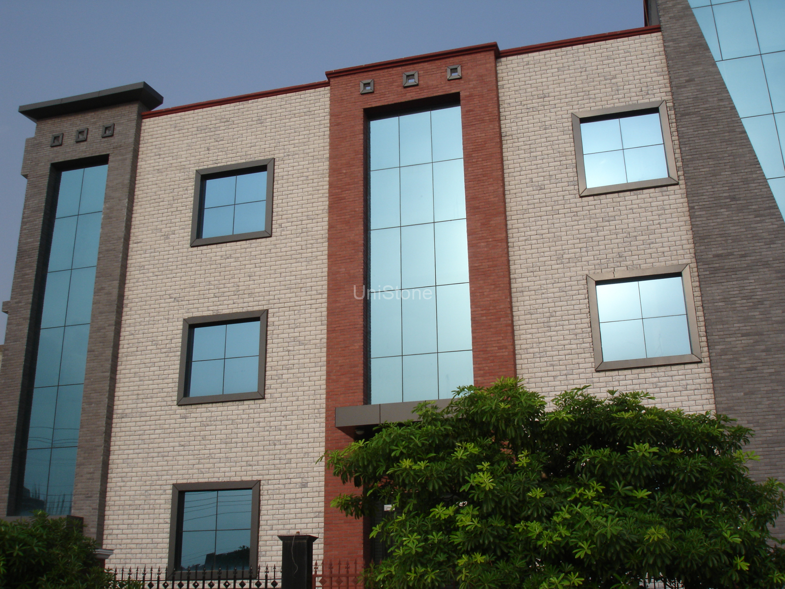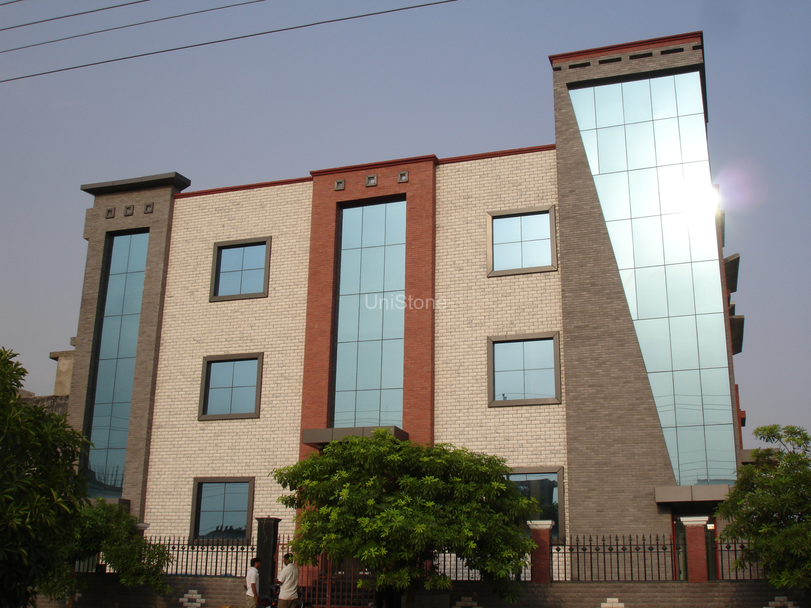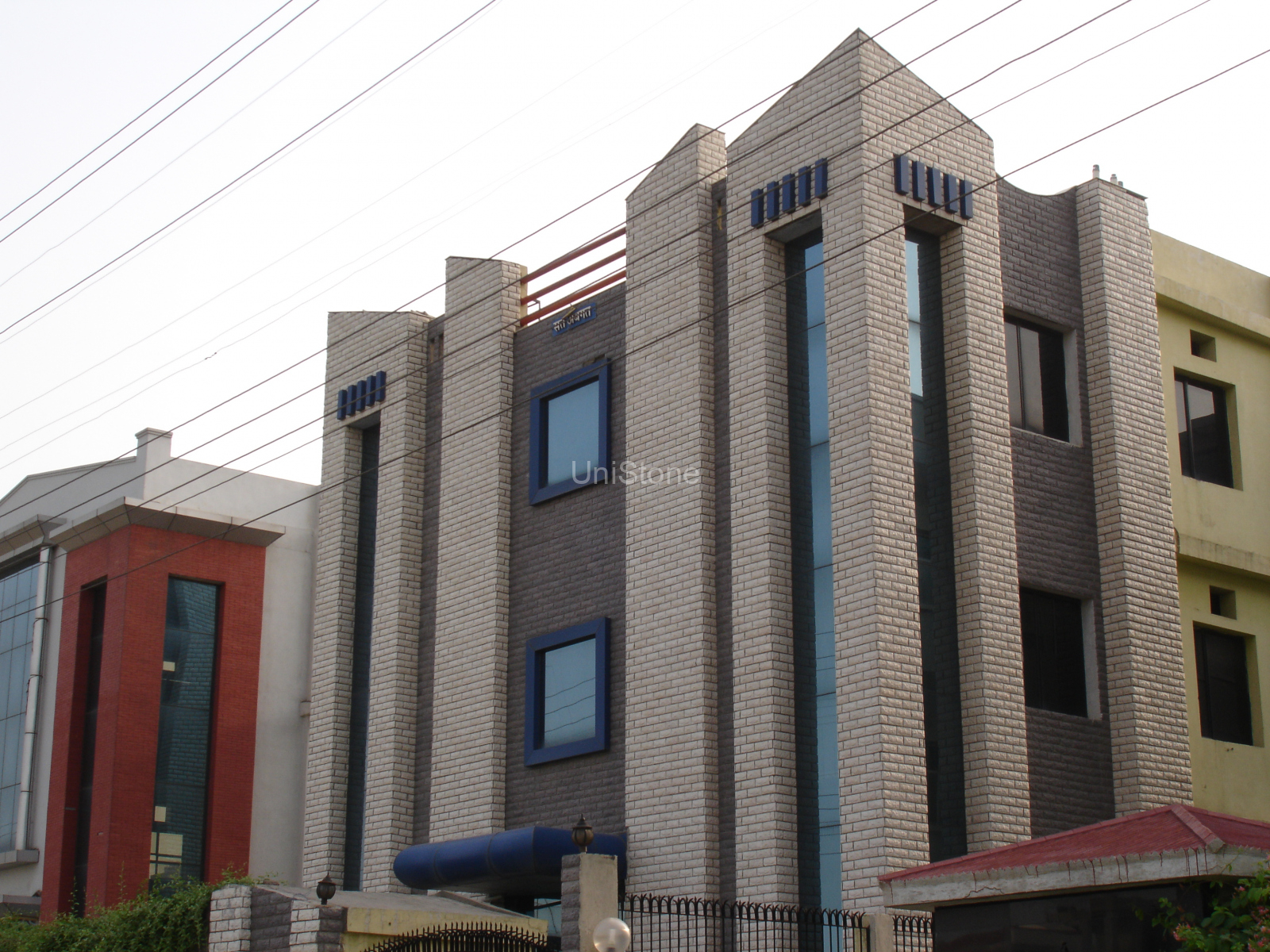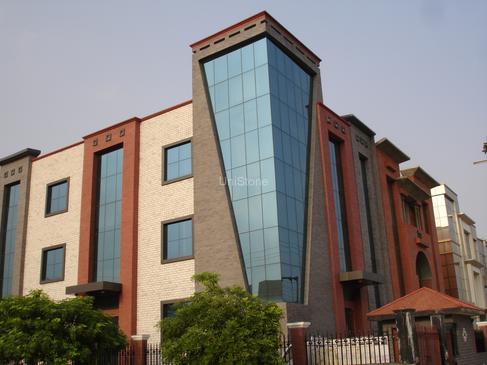 Unistone supplied and installed Castle Stone (White Grey) and UniBrick (Delhi Stone & Agra Red), covering approximately 7,000 sq. ft. of façade area.