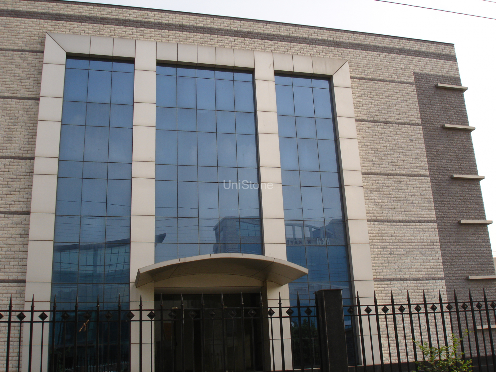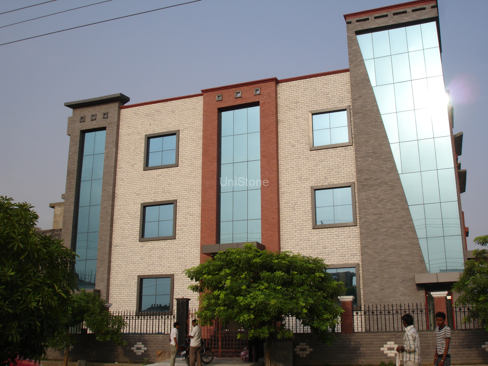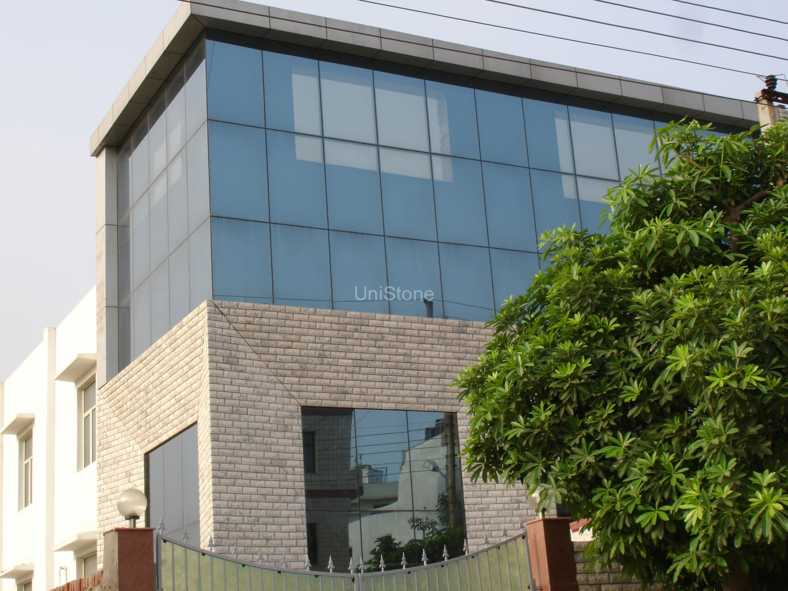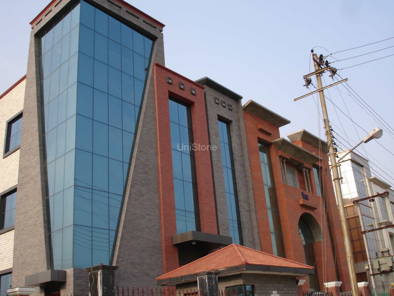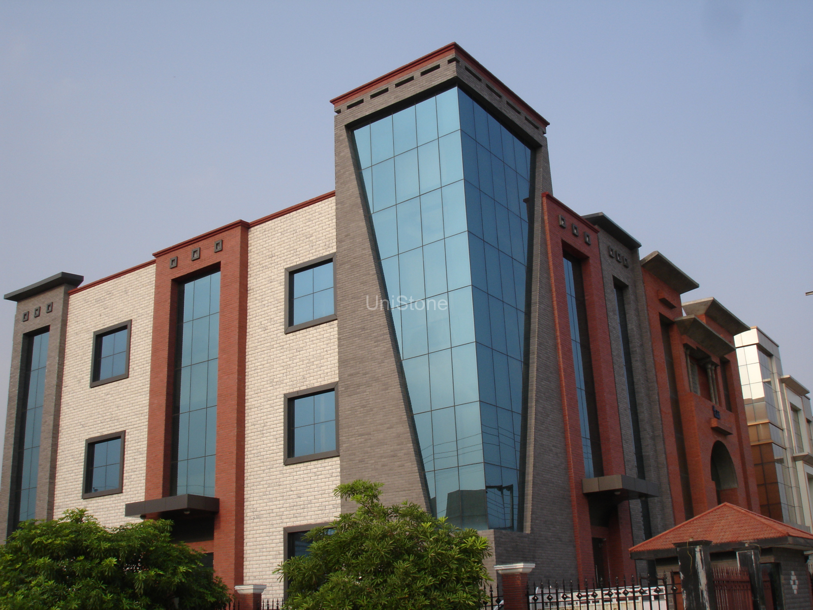 Unistone supplied and installed Castle Stone (White Grey) and UniBrick (Delhi Stone & Agra Red), covering approximately 7,000 sq. ft. of façade area.